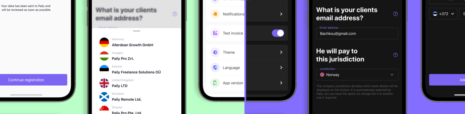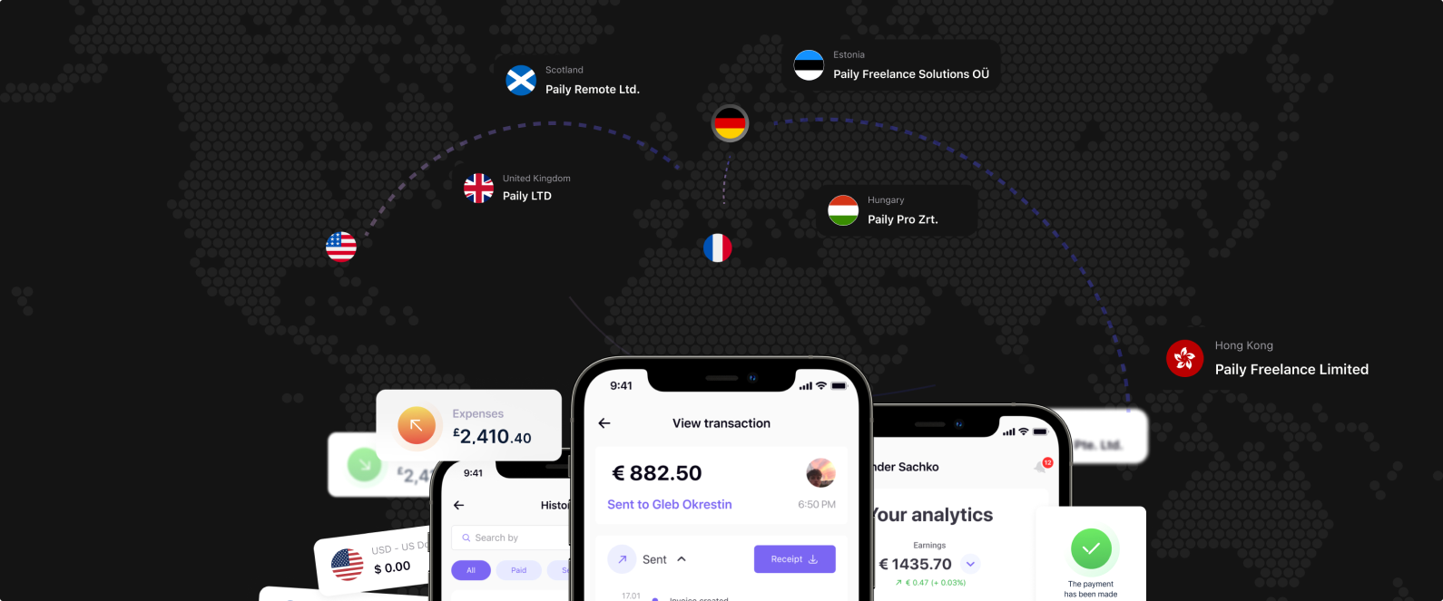 Paily Invoicing is based on a partnership agreement that allows you to use multiple legal entities to createan invoice and send it to your customers. Fill up the invoice details, choose an optimal jurisdiction. No bureaucracy, no bookkeeping, no hidden fees.